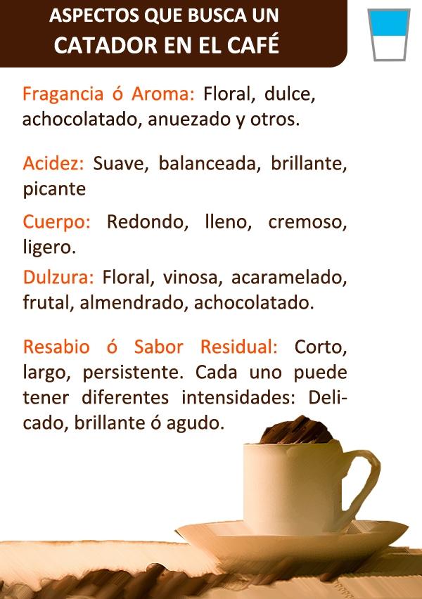 Luego con una cuchara se toman muestras de café y con un potente sorbo se ingiere la bebida para pasarla por el paladar de la boca. Este proceso se hace repetidas veces y puede detectar características como su dulzura, acidez, cuerpo, sabores cítricos, caramelizados y achocolatados. La muestra saboreada en el paladar se expulsa a un recipiente metálico. Finalmente el café es aprobado o desaprobado por el catador, según las características que el cliente pidió desde el inicio.